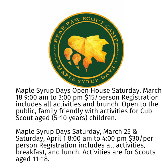 Two opportunities to experience Maple Syrup making at Bear Paw Scout Camp this Spring! | |