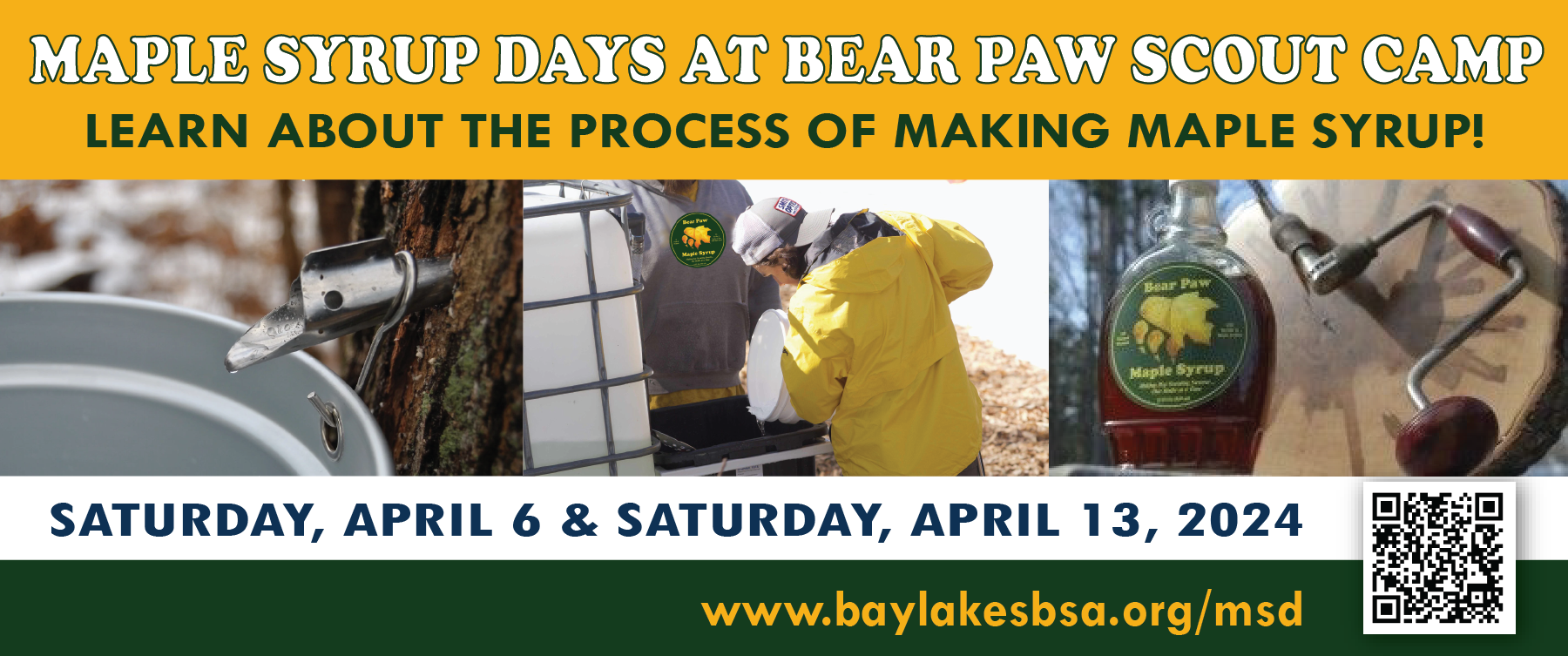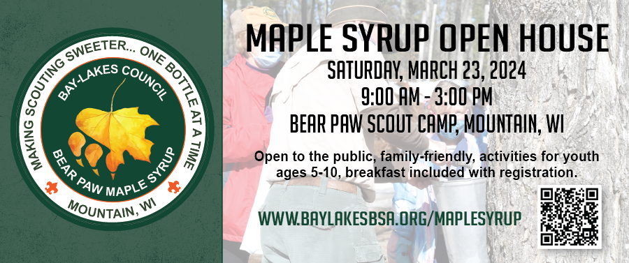 | | | | | | | | | | All of that wrapped up in a Scouting event! There are two opportunities to come to Bear Paw Scout Camp this spring and learn more about how we make maple syrup at Bear Paw…and of course try some of that amazingly tasty stuff that makes Scouting Sweeter One Bottle at a Time.